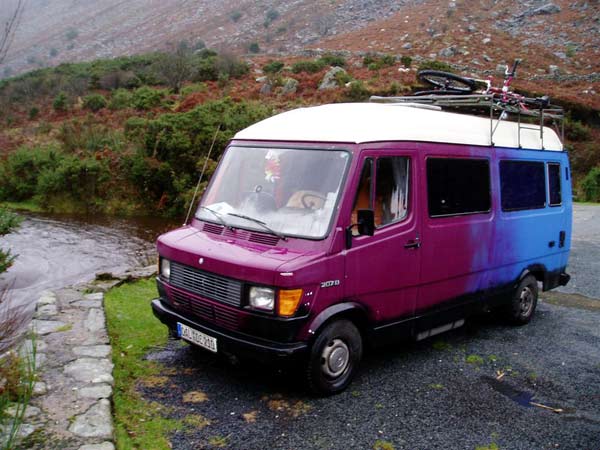 Das Fahrzeug ist ein Eigenausbau und für 8 Leute zugelassen (können aber auch 14 Platz nehmen). Es ist ein sehr treues Mädchen, welches mich noch nie im Stich gelassen hat und auch richtig arbeiten kann. Ich bin nun seit etwa einem Jahr damit in Irland unterwegs was leider auch seine Spuren hinterlassen hat. Der Vorteil hierbei ist jedoch, dass sich bisher noch niemand für den TÜV interessiert hat. Leider treten so langsam erste Alterserscheinungen auf wie Rostfras (auch unter Seitenfenstergummi), Kupplung scheint mir immer lockerer und bei Kälte rubbeliger zu werden und der Synchronring im Getriebe möchte bei höheren Drehzahlen auch nicht mehr so richtig. |