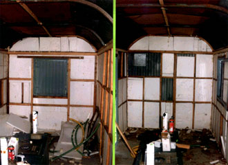Der Bauwagen wurde ausgeschlachtet. Sämtliche Leisten und Verstrebungen (Hölzchen mit 3 x 3 cm!) ersetzte ich mit richtigen, kleinen Balken. Die Fensterrahmen wurden schlicht und ergreifend durchgesägt, die Verankerungen am Rahmen gelöst.