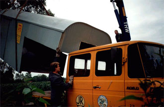 Aber wie kriegt man einen Sechs-Meter-Bauwagen mit rund zwei Tonnen Gewicht auf eine Lasterpritsche, die einen Meter hoch ist? Da bei uns chronischer Geldmangel angesagt ist, konnte ich schlecht die Firma Schmidbauer (Schwertransporte) oder dergl. beauftragen. Und da ich beruflich bedingt gute Kontakte zum THW hatte und habe, wurde eine "Übung" angesetzt. Drei Mann und ein Laster mit Kran besuchten mich auf der Wiese, auf der ich den Ausbau vornehmen wollte.
