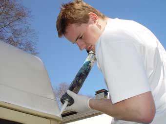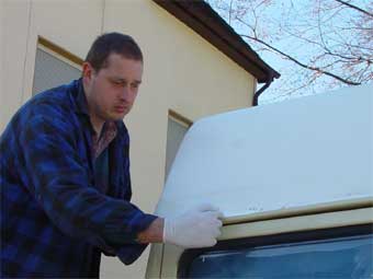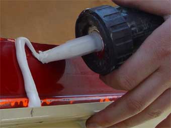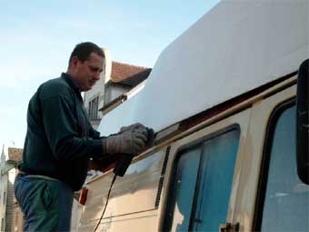 Nachdem nun alles ordentlich angepasst ist, können wir mit der Verklebung beginnen. Zum verkleben des Daches verwenden wir Sikaflex 252, einen dafür geeigneten Konstruktionsklebstoff, der in Kartuschen erhältlich ist. Für die Verarbeitung dieses Klebers ist unbedingt eine elektrische Kartuschenspritze bzw. eine solche mit Pressluftunterstützung anzuraten, da der Kleber sehr zäh ist und mit normalen, manuellen Kartuschenpistolen nur äusserst mühsam und eigentlich viel zu langsam ausgepresst werden kann. Die Hautbildezeit dieses Klebers liegt bei ca. 40min. Bis dahin sollte das Dach montiert sein! |