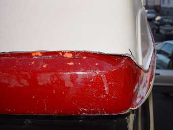 In diesem Stadium stellt sich heraus, daß das Dach nicht passt! Es ist zu kurz und recht somit nicht bis über die vordere Nase. Auch ist es im vorderen Bereich ein klein wenig zu schmal. Wir entschliessen uns nach reiflicher Überlegung, das GFK-Dach anzupassen, da wir möglichst nicht noch mehr Blech von der Karosserie wegnehmen möchten. Es ist schon ein Leid mit der Passform von solchen GFK-Teilen... |