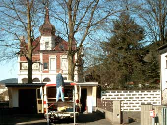 Nun kommt der große Augenblick - Die Hochzeit! Das Hochdach wird mit der Karosserie verbunden. Hierzu heben wir das Dach hoch, um dann mit dem Bus daunter zu fahren. |