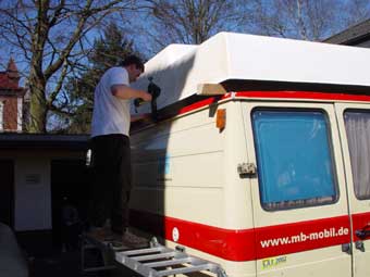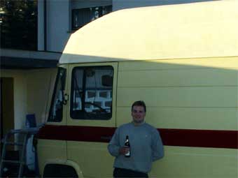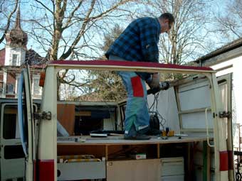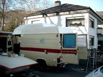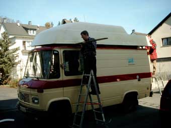 Somit konnte ich nun mit der Arbeit anfangen. Nach Rücksprache mit der ortsansässigen TÜV-Prüfstelle wurde vereinbart, daß die Spriegel 1:1 aus dem vorherigen Fahrzeug übernommen werden. An dem GFK-Hochdach hing nämlich noch ein Stück Auto. Das Dach wurde seinerzeit einfach mit ca. 10cm Blech von der ursprünglichen Karosserie getrennt.
